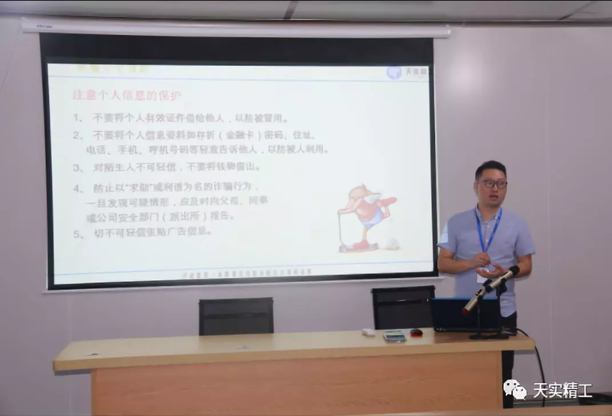 人力資源行政中心經理楊康 從三個方面為大家講述了安全知識,一是如何做好防盜工作,列舉了一部分盜竊事件,重點講述了日常生活中防盜的相關注意事項及相應的防范措施。二是如何預防詐騙。講述了網絡、短信詐騙等典型案例,讓員工真切地感受到身邊存在的安全隱患。三是如何預防搶劫大量現金到銀行取款、存款,陌生人的推銷、飛車搶奪等如何防范,讓員工了解各種欺詐盜竊手段及潛在的安全隱患,提高警惕,增強對財產及自身的保護能力。